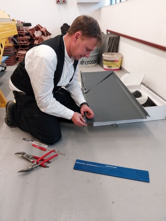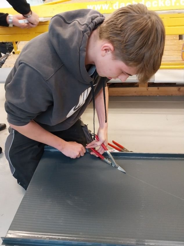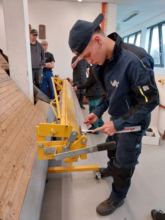 Firma BLACHOTRAPEZ uspořádala pro naše klempíře a pokrývače skvělý workshop v našich dílnách v Heleníně. Na začátku krátký úvod a seznámení se sortimentem, ale pak hurá na praktické nácviky, na což byli naši žáci natěšení nejvíc. Zástupci firmy přivezli spoustu materiálu a nikdo se nemusel obávat, když se něco nepovedlo hned napoprvé. Zkušení pracovníci firmy odpověděli na všechny otázky, předvedli, poradili, vysvětlili. Na workshop se přijel podívat i regionální přednosta Cechu klempířů, pokrývačů a tesařů pan David Štangl. Nebál se do workshopu i aktivně zapojit a vlastníma rukama si také vyzkoušel práci s plechem. Žáci to ocenili.